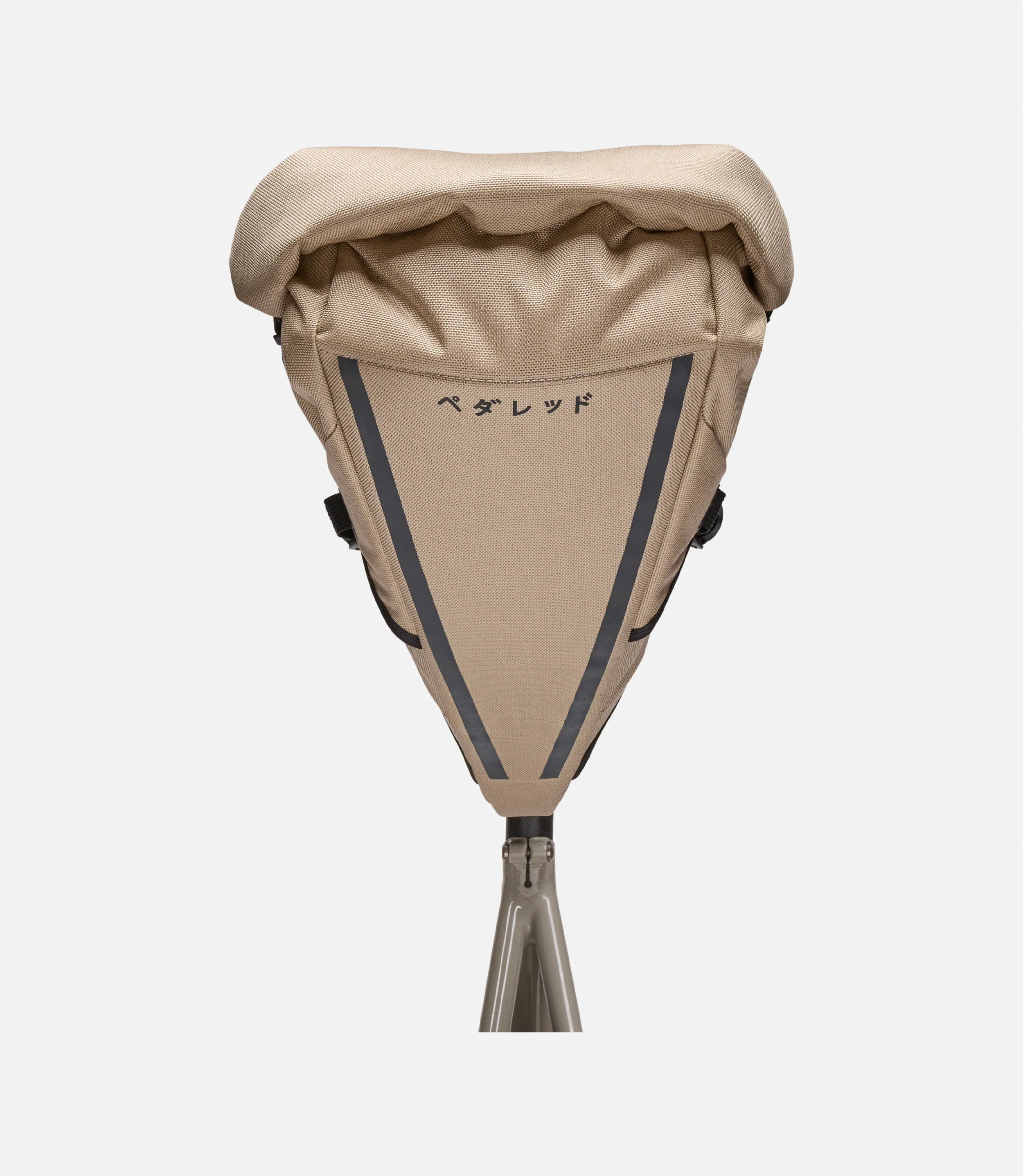 Our expandable roll-top bikepacking saddle bag, crafted from weather-resistant Cordura fabrics and featuring a large reflective logo.